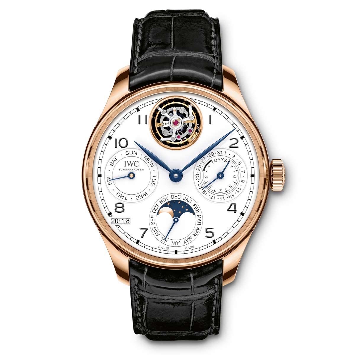 The watches with a white dial have blued hands, while those with a blue dial have rhodium-plated hands. The idea for the imprinted dials and blue hands came from the first Portugieser models, Reference IW325, from 1939.